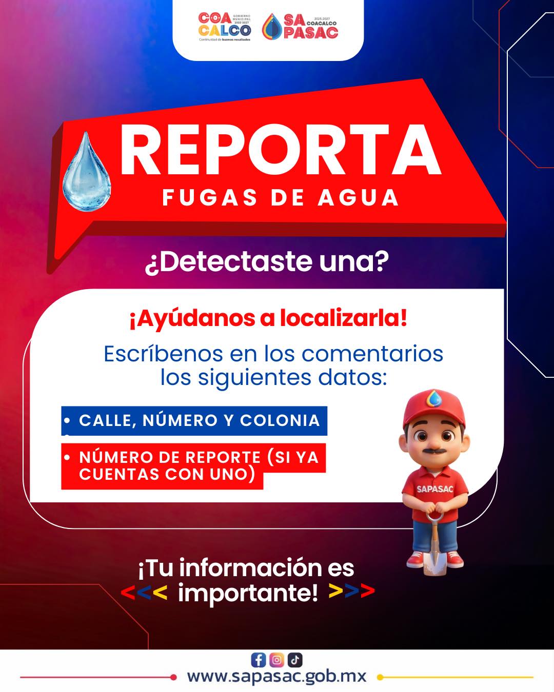 SAPASAC trabaja para asegurar el acceso continuo y eficiente al agua potable, así como la correcta gestión de alcantarillado y saneamiento, con un enfoque en la mejora constante de la infraestructura y la calidad de vida de la comunidad de Coacalco.